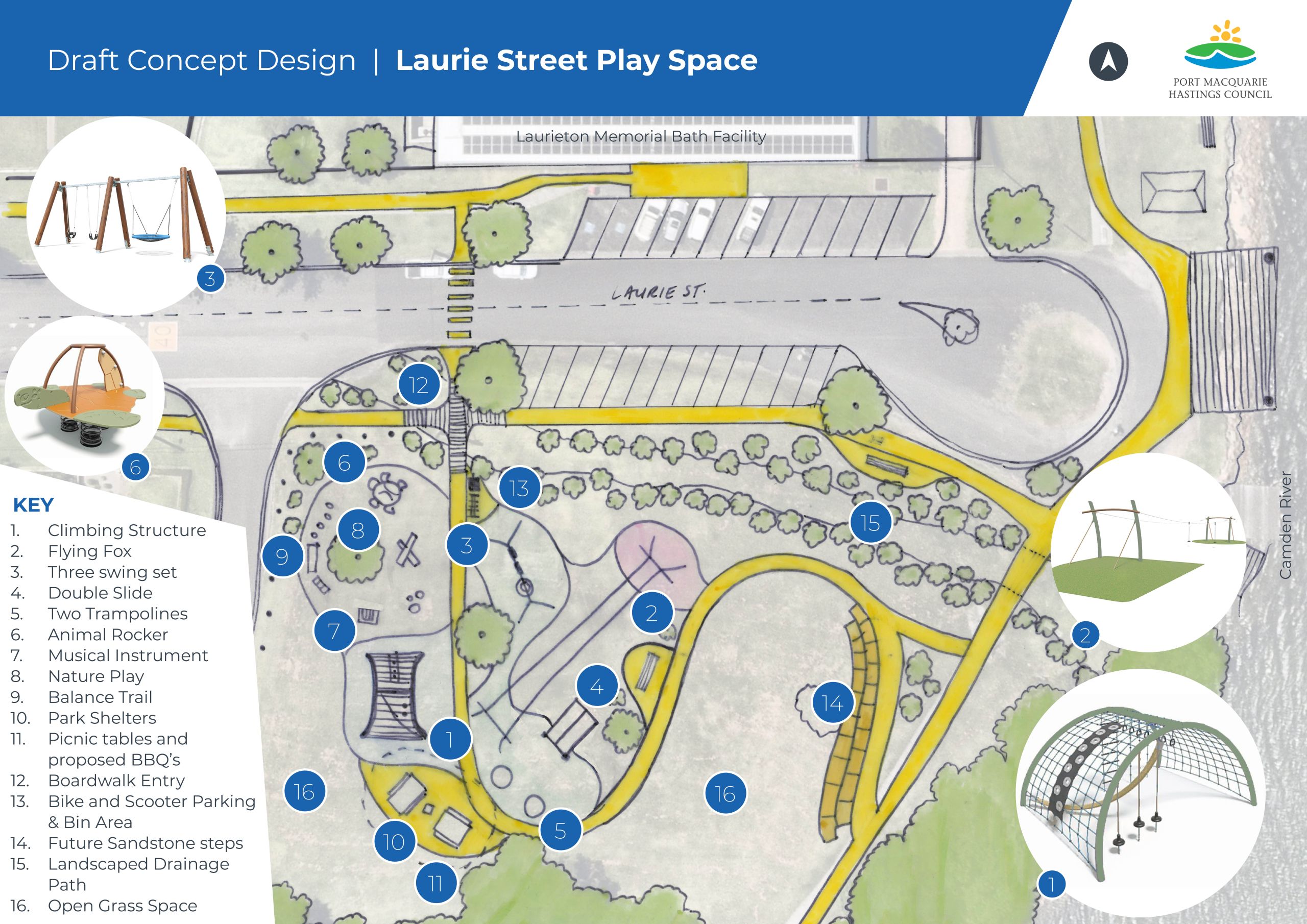 Laurie Street has been identified as a regional play space for the Camden Haven community, which means it will cater to the wider community, attracting visitors from across the region and accommodating key recreation needs.