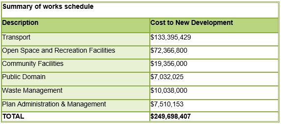 The draft plan aims to levy approximately $250 million in contributions to deliver about $660 million worth of infrastructure and services.